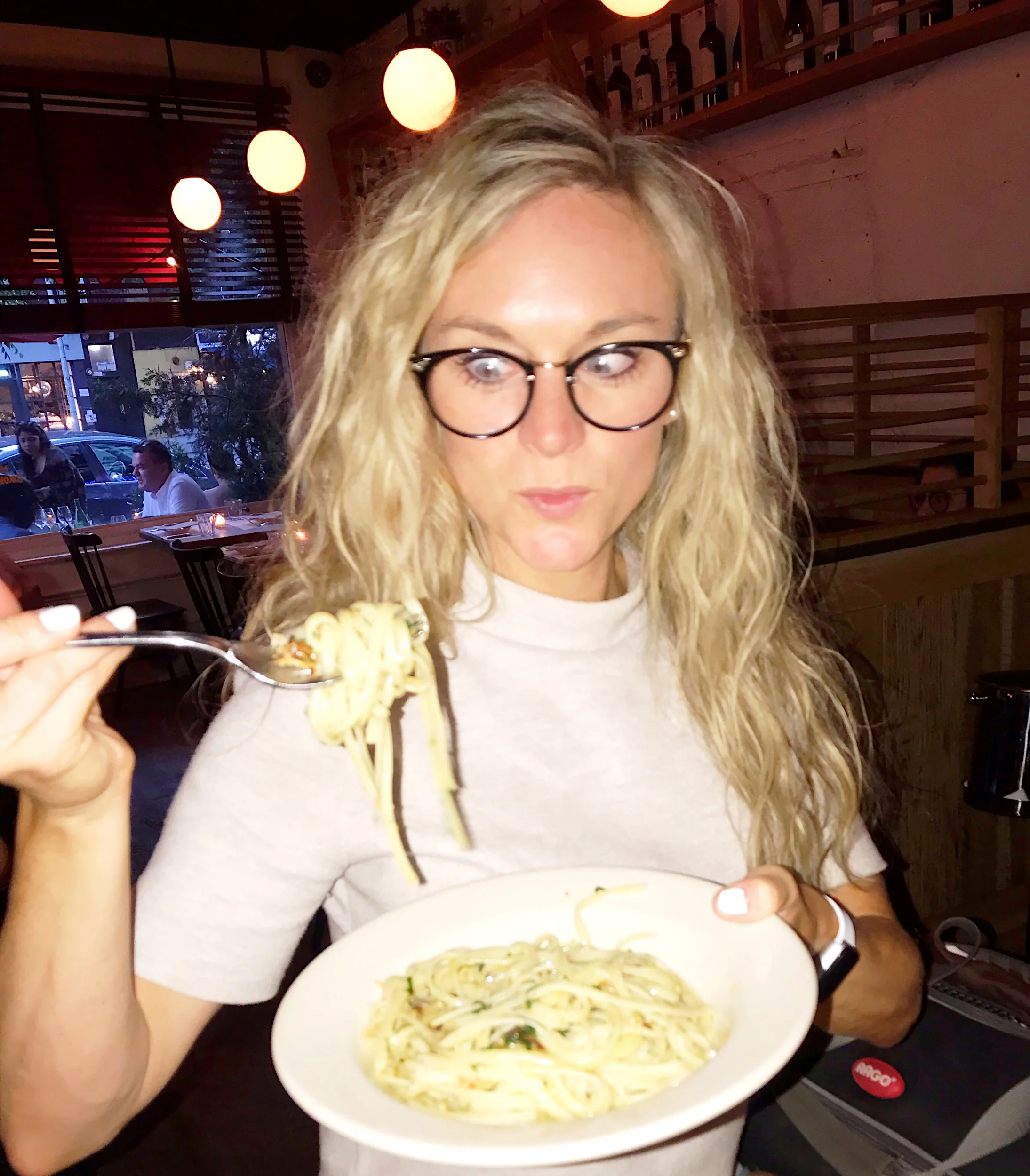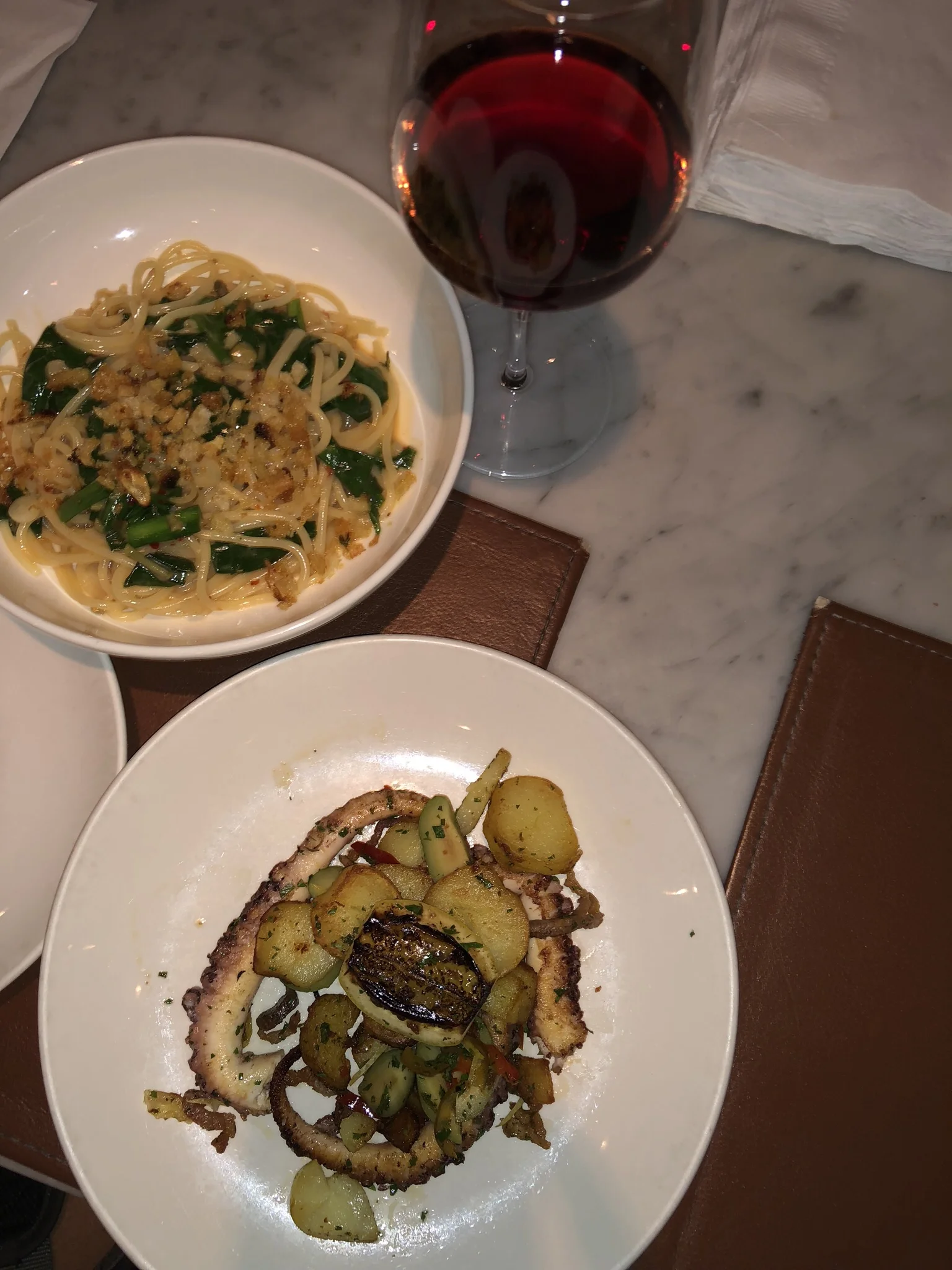 Hands down, this was our favorite restaurant on the pasta hop and period on this particular trip. We rarely re-visit restaurants on the same holiday, but we went to this one back to back days! Pasta they’re known for: Tagliatelle with Peas, Prosciutto, Parm – unbelievable! What else they should be known for: their Negroni. It’s the best one I’ve ever had, and we snagged the secret from the bartender so have been making the them Via Carota-style at home since we got back. What else we got: Anchovy Butter Toast, the gigantic octopus that had so much flavor!!