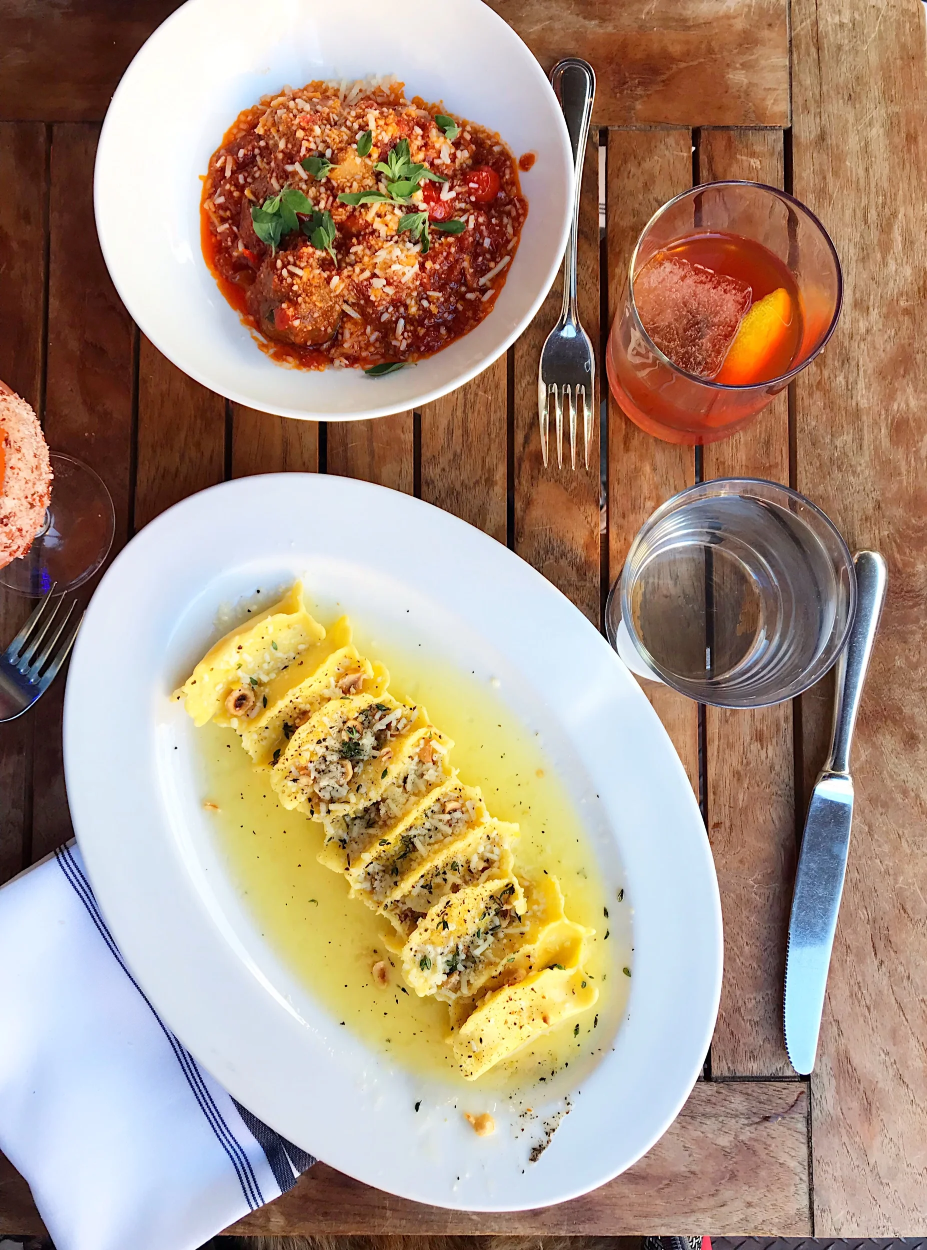 This place had my favorite pasta dish on the hop. They’re known for their Borsa “Little Purse” with Ricotta, Butter, Lemon, Hazelnut. The little dumplings are called Borsa because they actually look like little purses - little purses filled with the creamiest, most cloud-like texture and bursting with butter and bright lemon flavor. We also had the meatballs and loved them. Cocktails here were stellar too and the patio is the way to go!