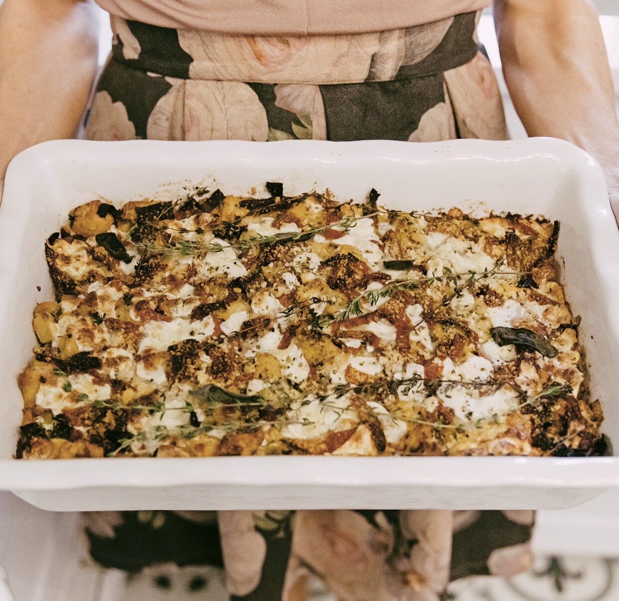 Preheat oven to 350 degrees. In a large bowl, add the bread cubes and coat with olive oil. Add 3/4 of the mozzarella cubes, 3/4 of the pepperoni, pepperoncini, sun dried tomatoes, parsley, sage, and thyme. In a separate bowl, whisk together the eggs, stock, Italian seasoning, salt, pepper, and half of the Parmesan. Add the egg mixture to the bread mixture and stir together until the bread is coated. Pour into a greased 8x12 baking pan. Top with the remaining mozzarella, pepperoni, and Parmesan. Bake for 20 to 30 minutes or until golden and bubbly. Garnish with thyme sprigs if desired.