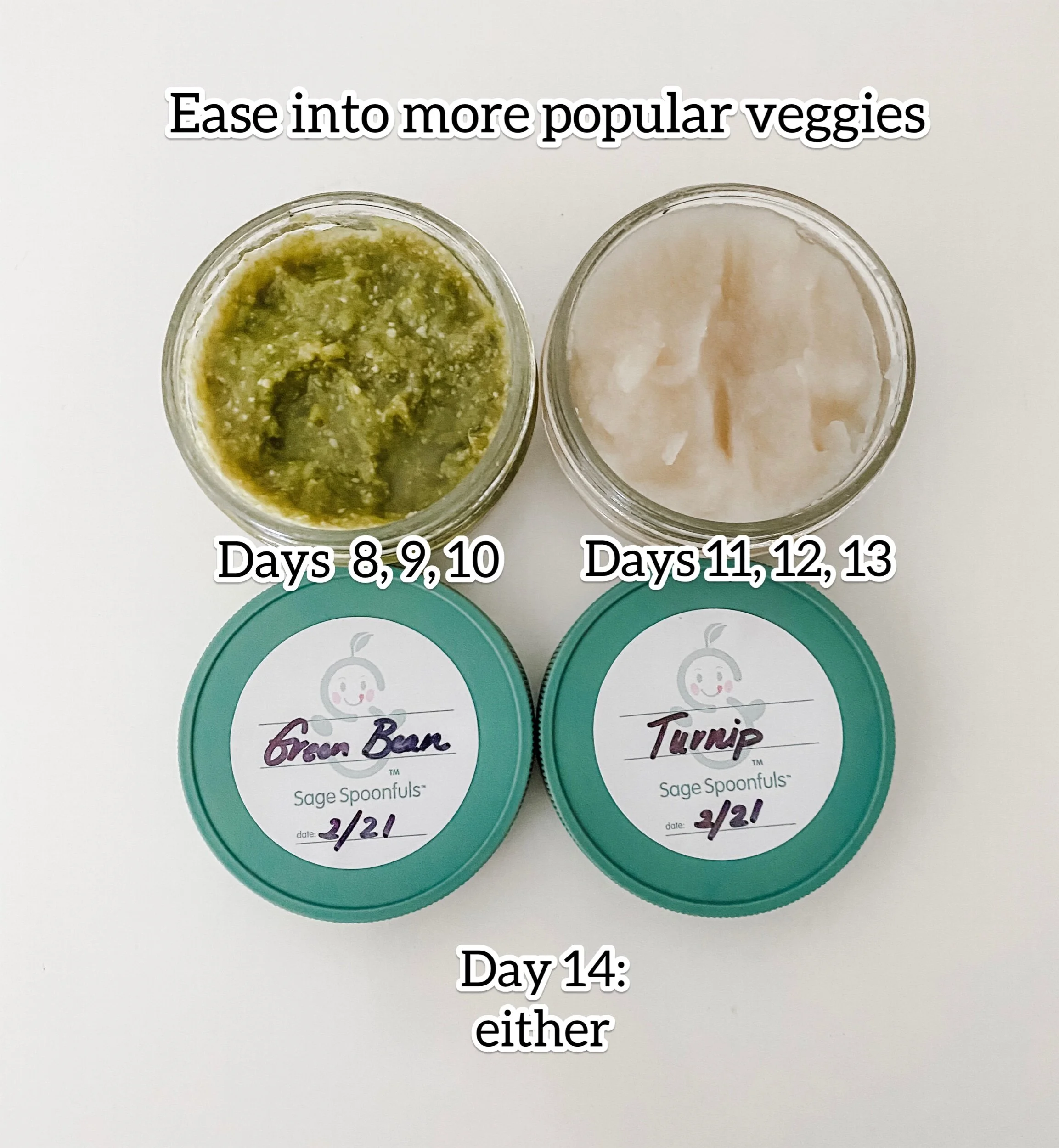 Introduce a new veggie every 3 to 4 days (about 6 veggies the first month) - I’m strictly following what I’ve read the French recommend doing here. It’s all about “taste development” to them and they believe (and statistically are right in most cases) this gets your baby liking and eating all foods at a young age.