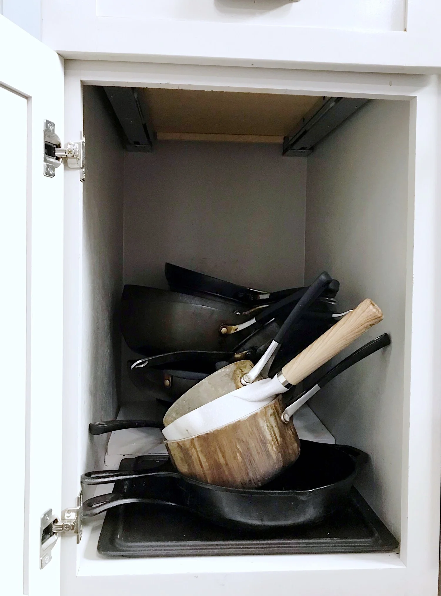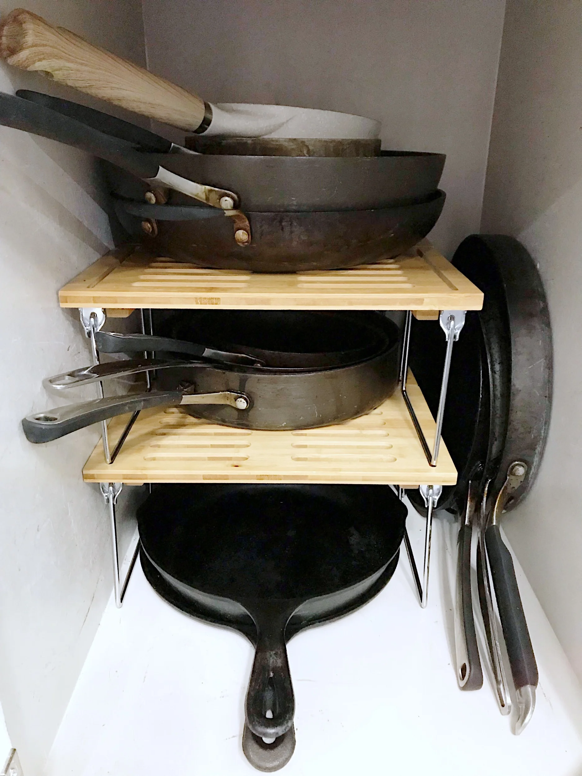 I’m ashamed to even show the before of this cabinet. When we moved in, there were shelves and it was quite organized. But the shelves weren’t sturdy ones and my heavy load of pots and pans broke them, and I never had them replaced. Thankfully, Bamboo Stackable Shelves came through! With just a few shelves, my cabinet is completely transformed. These come in multiple sizes so will fit any cabinet perfectly. And they snap together tightly and are super sturdy.