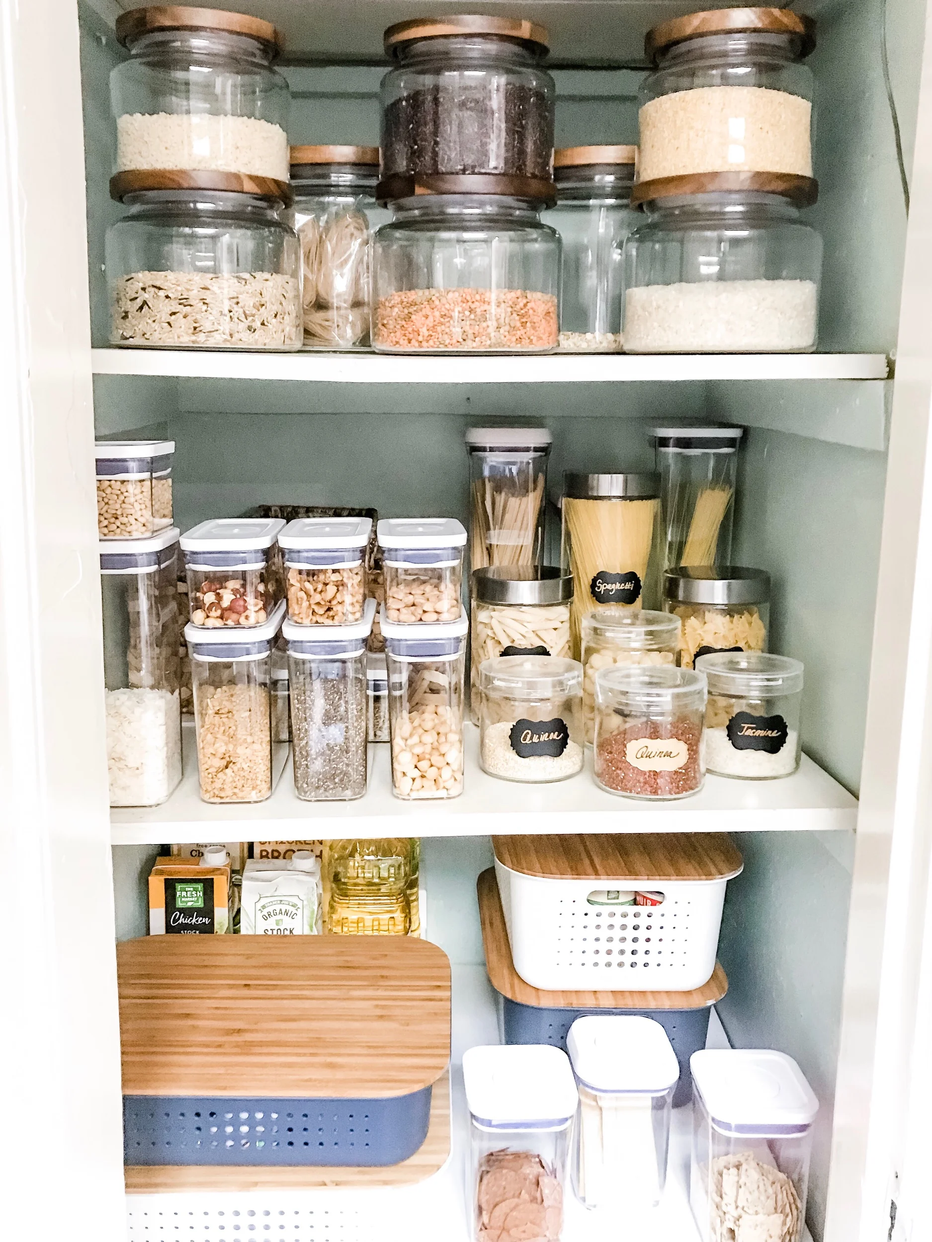 This is where I keep canned goods, nuts and grains, snacks, and a few of my most-used appliances. While I already had a few things in labeled storage containers, I still had several items still in their packaging. I realized as I cleaned out the baskets where the non-labeled items are stored, I tend to cook with the labeled items more often and forgot I even had some of the non-labeled items. I decided I wanted everything in its own storage container.